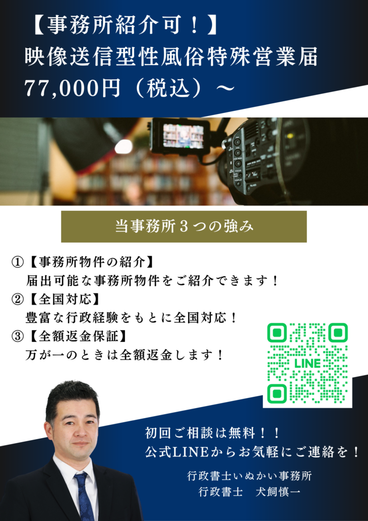 先日は「映像送信型性風俗特殊営業届出」の手続きを迅速かつ丁寧にご対応いただき、本当にありがとうございました。